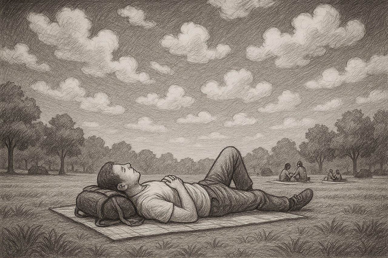 공원 들판 한쪽에 돗자리를 펴고, 백 팩을 베개 삼아 누웠다. 휴대전화 타이머를 10분으로 맞췄다. 10분만 잔잔한 평화를 만끽하겠다는 나만의 제약이었다. 설렁설렁 불어오는 바람, 무엇이 그리 재밌는지 모를 아이들 웃음소리, 부부들의 낮은 대화. 소음은 많았지만 이상하게도 불편하지 않았다. 흔들림 하나 없는 잔잔한 물 위보다 망망대해의 고루 흔들리는 물결이 더 평화롭다는 말을 지금이라면 백번 공감한다.