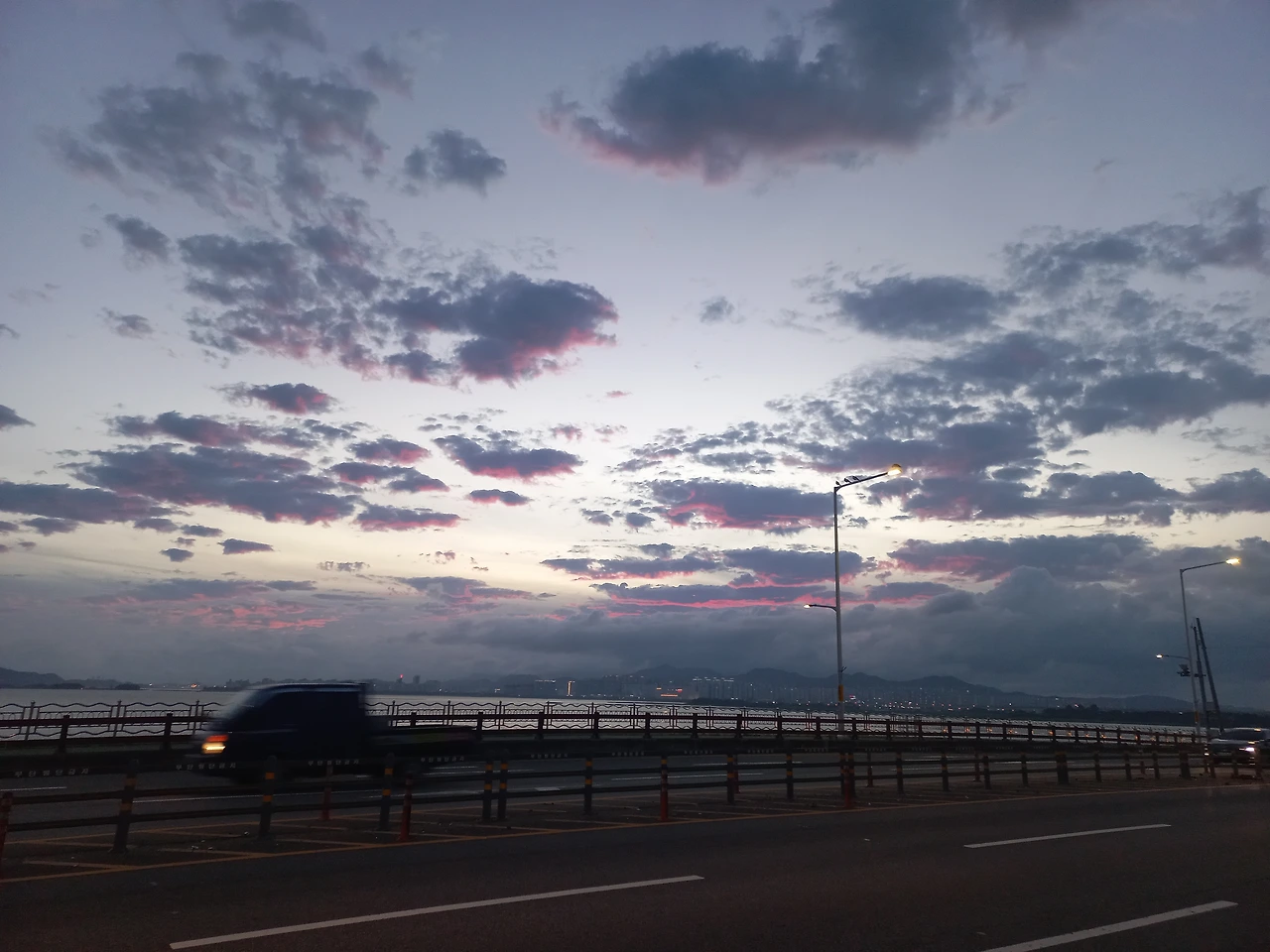 다시 길을 재촉해 부네치아에 불빛이 켜지는 야경을 뒤로하고, 을숙도 대교를 지날 때였다. 시커먼 먹구름 뒤로 숨어 있던 저녁노을이 장미꽃