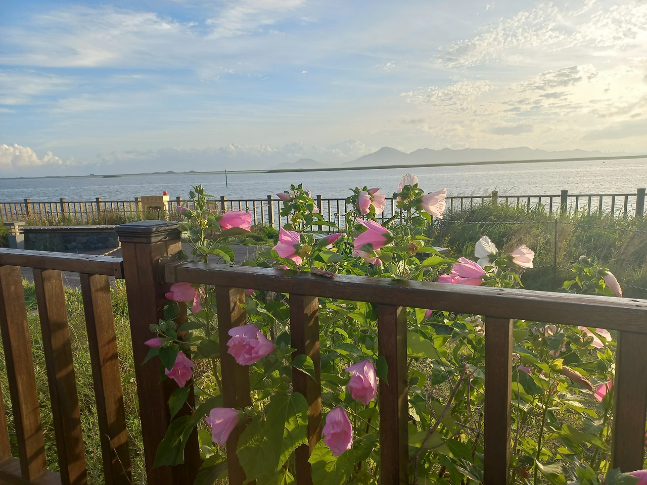 그곳에는 부용화가 피어 있었는데 무궁화를 닮았지만 훨씬 컸다. 그리고 예뻤다. 또 “석양 속의 날갯짓”이라는 고니의 날갯짓이 장식되어 있는 작품이 있었는데 앞에서 단체 사진도 찍었다.