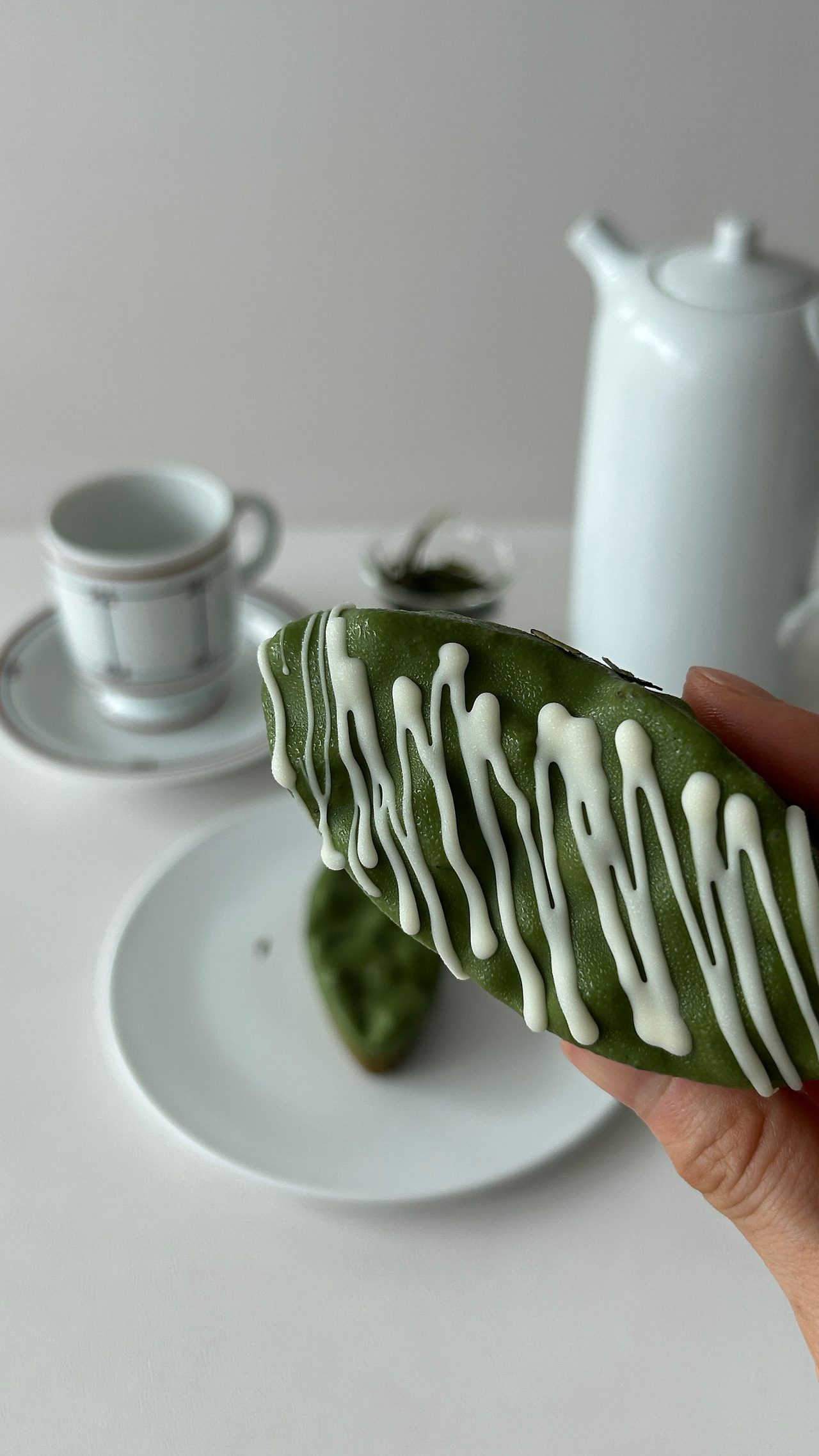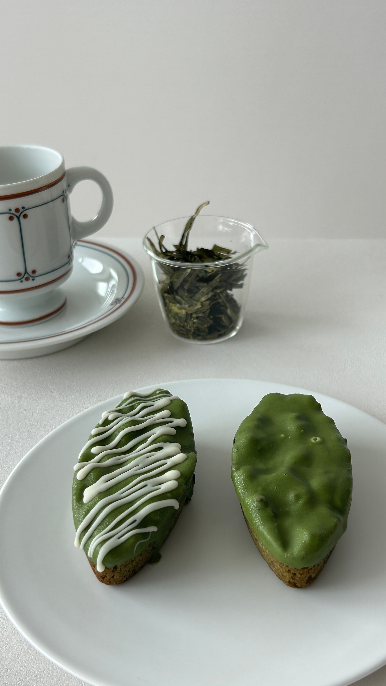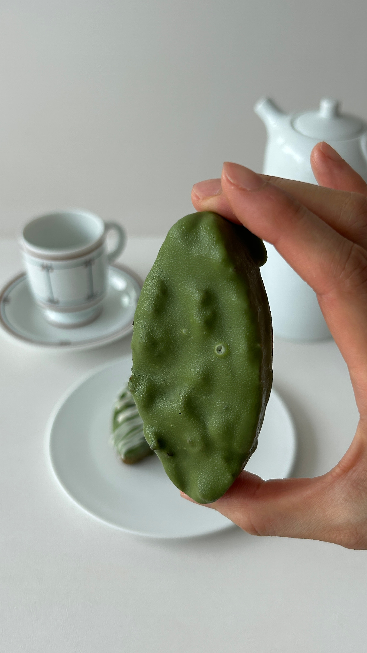 9. 식히는 동안 코팅 초코 준비 – 초콜릿을 녹이고 말차가루를 섞어 매끈하게 만든다.