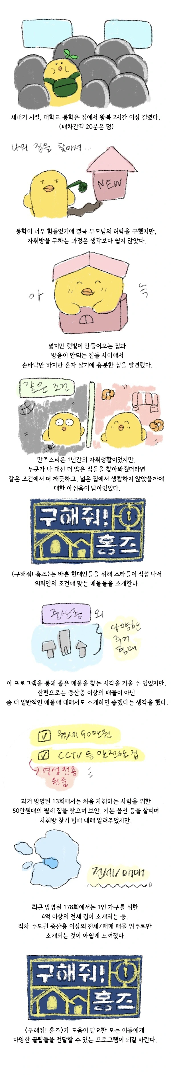 만족스러운 1년간의 자취생활이었지만 누군가 나 대신 더 많은 집들을 찾아봐줬더라면 같은 조건에서 더 깨끗하고 넓은 집에서 생활하지 않았을까에 대한 아쉬움이 남아있었다.