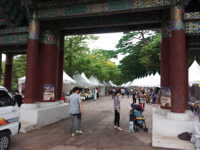 사찰 담벼락에는 흰 천막들이 죽 널어 서서 장마당을 이루고 있었다.