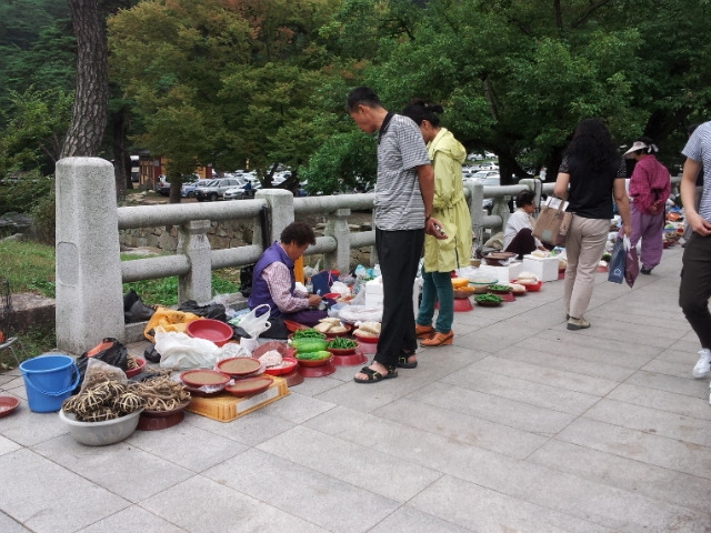 주차장에 차를 댄 후 절 구경할 요량으로 자그만 다리를 건너는데 다리 위에는 할머니들이 졸졸이 늘어 앉아 산 야채, 나물 등을 벌려 놓고 팔고 있고