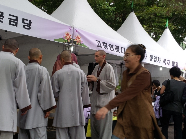 스님들도 간만의 구경거리에 무리로 늘어서서 소박한 물욕을 드러낸다.