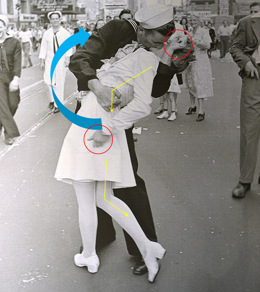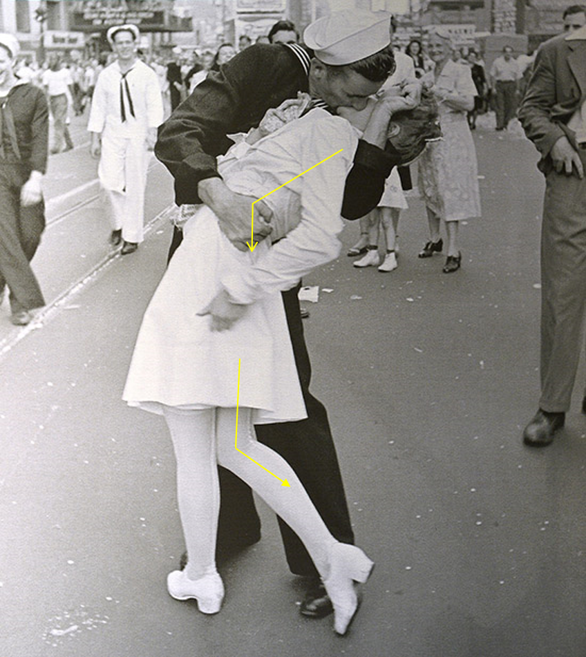 "그래서, 이 사진을 처음 보았을 때 나의 결론은 '이 두 사람은 서로 모르는 사이다.'였습니다. 흥분한 다혈질의 남자가 너무 감정에 북받친 나머지 자기도 모르게 옆에 있던 여자를 끌어안고 키스세례를 퍼부은 것으로 추정했지요. 그리고 그것은 나중에 사실로 밝혀졌습니다."
