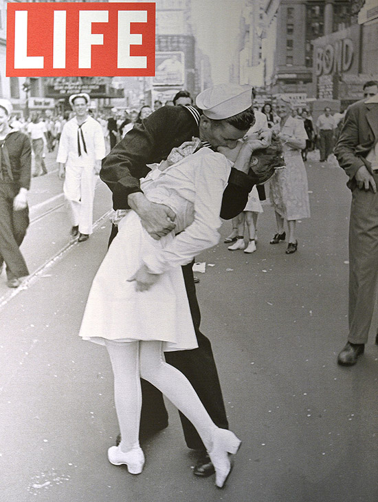 "이 사진은 1945년 8월 14일(미국 시각) 제2차 세계대전이 끝나던 날, 일본 국왕의 항복선언 육성이 전파를 타고 라디오에서 흘러나오는 순간, 감격에 겨운 뉴욕시민 수만 명이 타임스퀘어 광장으로 뛰쳐나와 환호할 때, 한 수병과 간호사가 감격에 겨워 키스하는 정면을 마침 그 자리에 있던 '라이프'지 기자가 포착하여 표지사진으로 올린 것입니다. 그 후 이 장면은 가장 감격적인 세기의 키스신이 되어 수많은 패러디물까지 낳았지요."