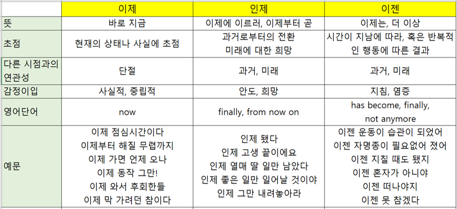 이제: (명사) 바로 이때. (부사) 바로 이때에. 지나간 때와 단절된 느낌을 준다.