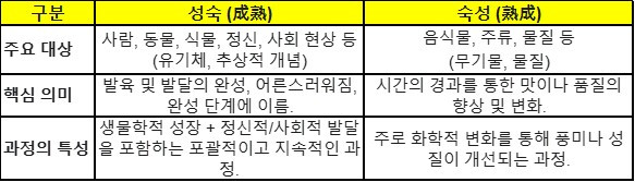 * 성숙과 같은 한자 조합이지만, 주로 물질이 '익어가는(熟)' 과정을 거쳐 특정한 '결과나 상태(成)'를 얻는 것에 중점을 두. 특히 음식물 따위가 시간의 경과와 화학적 변화를 통해 맛과 품질이 깊어지는 과정을 나타낼 때 쓰는 말.