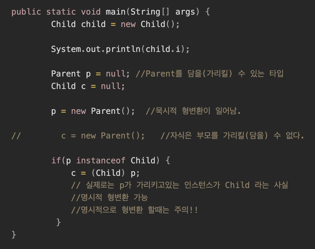 부모클래스 타입으로 참조된 객체를 다시 자시 자식 클래스 타입으로 변환하는 것(부모 클래스를 자식 클래스로 변환) 명시적 형 변환이 필요하며, 안정성을 위해 instanceof로 확인해야 함.