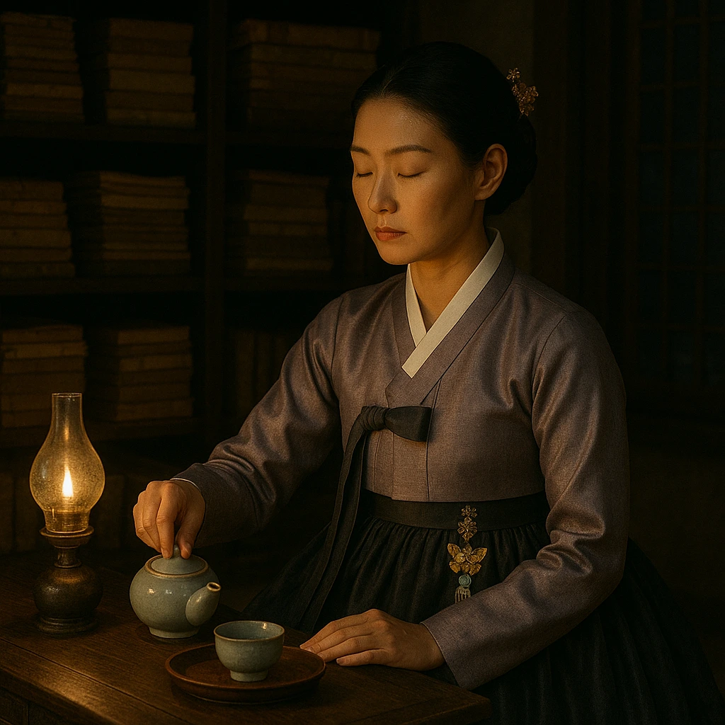 옥련이 조용히 들어서며, 차를 올려놓고 고개를 숙였다.