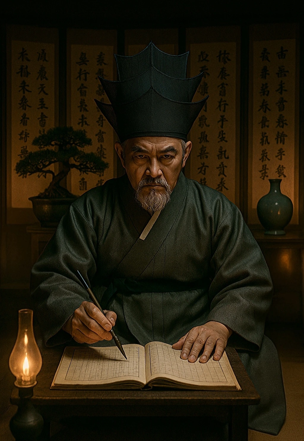 김동신은 홀로 앉아 장부를 펼친 채 붓끝을