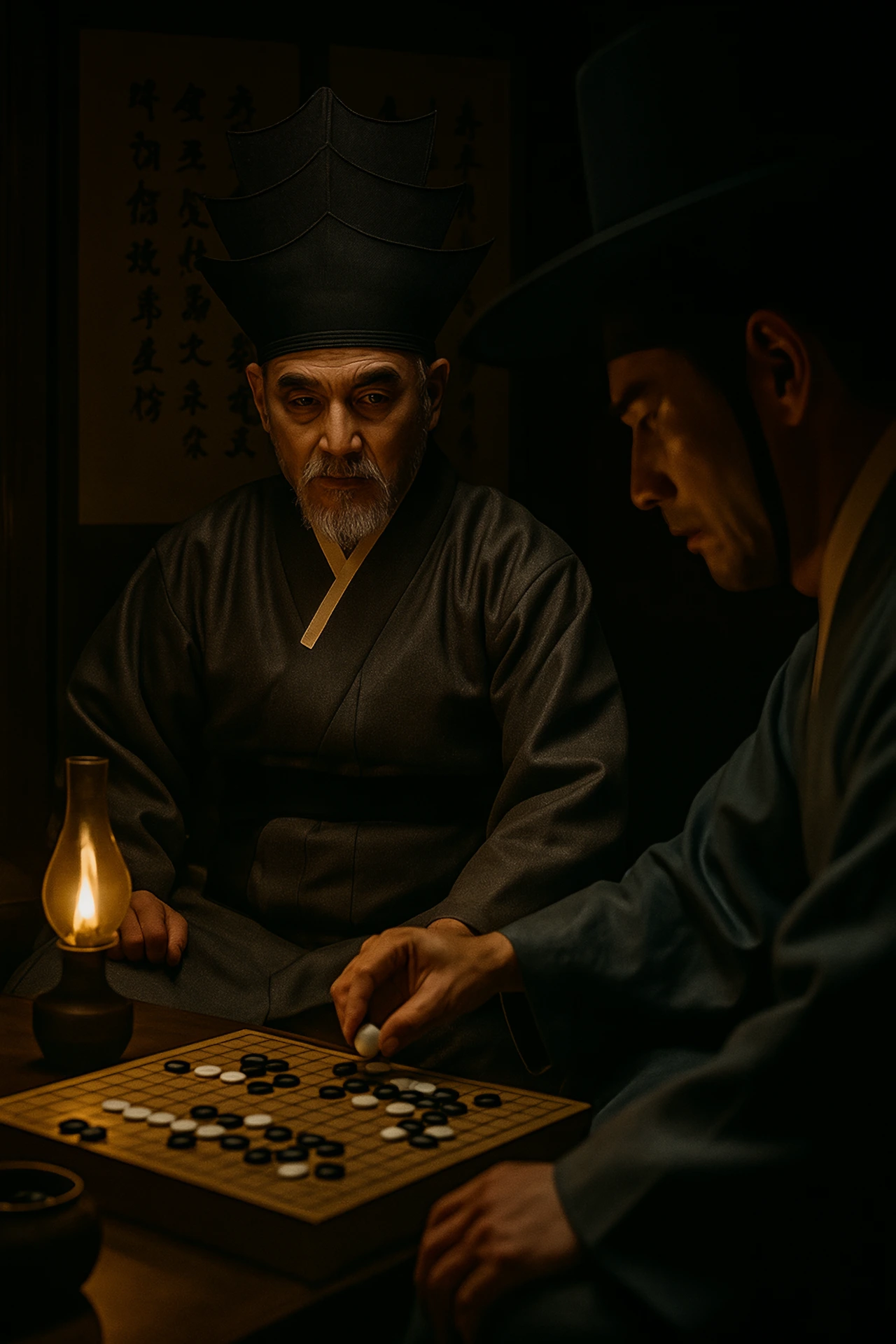 등잔불이 바둑판 위를 비추며,