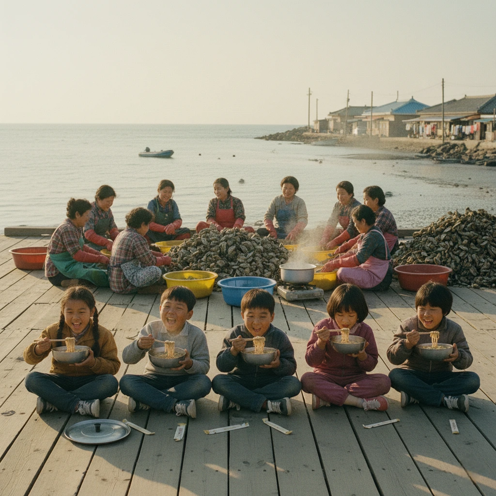 굴 비린내와 국수 김이 선착장 끝까지 퍼져갔다.