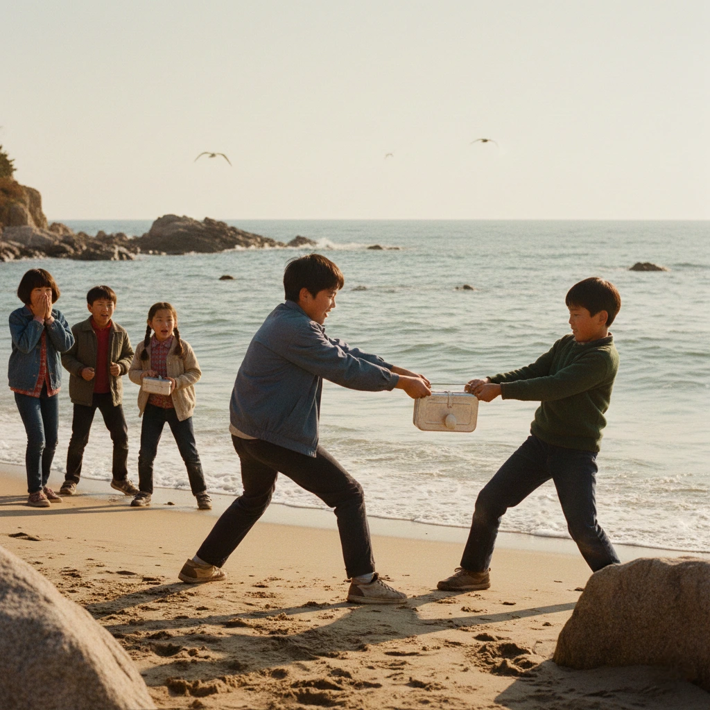 누구는 모래 위에 떨어진 뚜껑을 주워