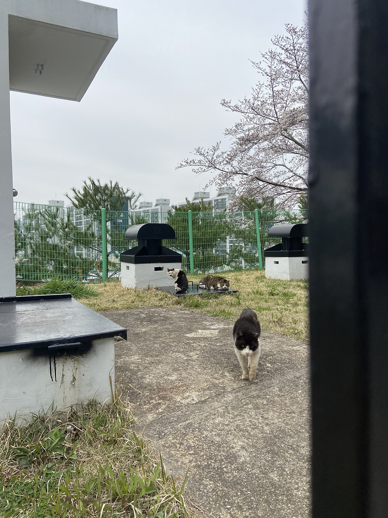 아파트 단지 내에 철장 너머로 꼬질꼬질한 길고양이 3마리가 쉬고 있었다.