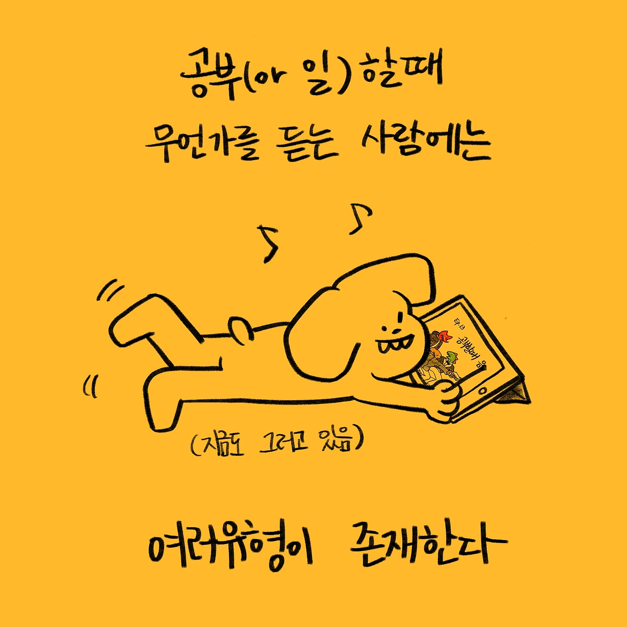 이번 화는 <공부할 때 듣는 음악에 대하여>입니다. 정말 다양한 취향이 존재합니다만 그 무엇이 최고다 라고 말할 수는 없는 것 같아요. 개인마다 취향이라는 게 있는 잘 맞는 공부법이 있고 아닌 것처럼 말입니다!