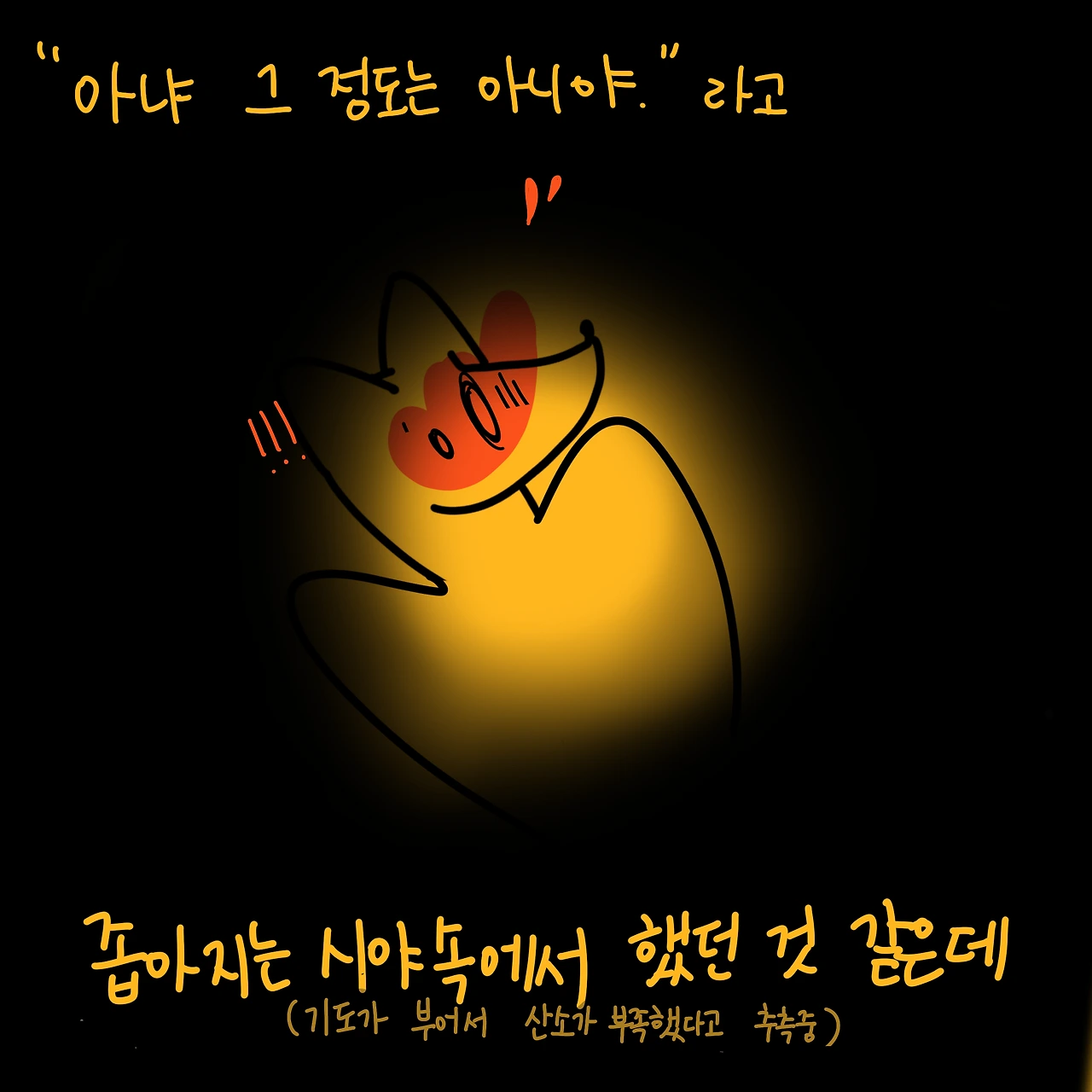 지금에서야 웃으며 말할 수 있지만 "주마등인가?"에는 사실 진심이 약 53% 정도 섞여있었습니다. 분명 농담조긴 했지만 눈앞이 흐려지고 중심이 잡히지 않는 환경은 꽤나 공포스럽더라고요. 다신 하고 싶지 않은 경험입니다. 하하...