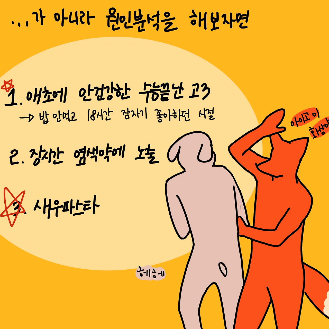혹여나 이번에 수능을 보시는 분들이나 수험생 자녀가 계시다면 꼭 수능 끝나고도 밥 잘 먹으라고 해주세요. 저처럼 하루에 한 끼를 바나나로 먹고 나머지 시간은 자는 생활을 유지하다간 면역체계가 박살 납니다. 정말 진심으로요...