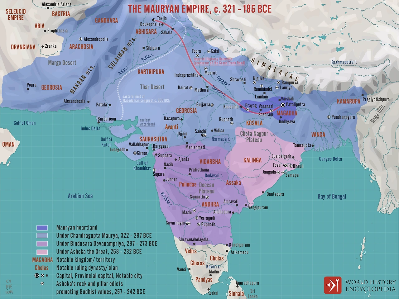 마우리아 왕조의 최대 영역 지도, 보라색이 마우리아 왕조의 초기 영토입니다. 출처: 세계사 백과사전)