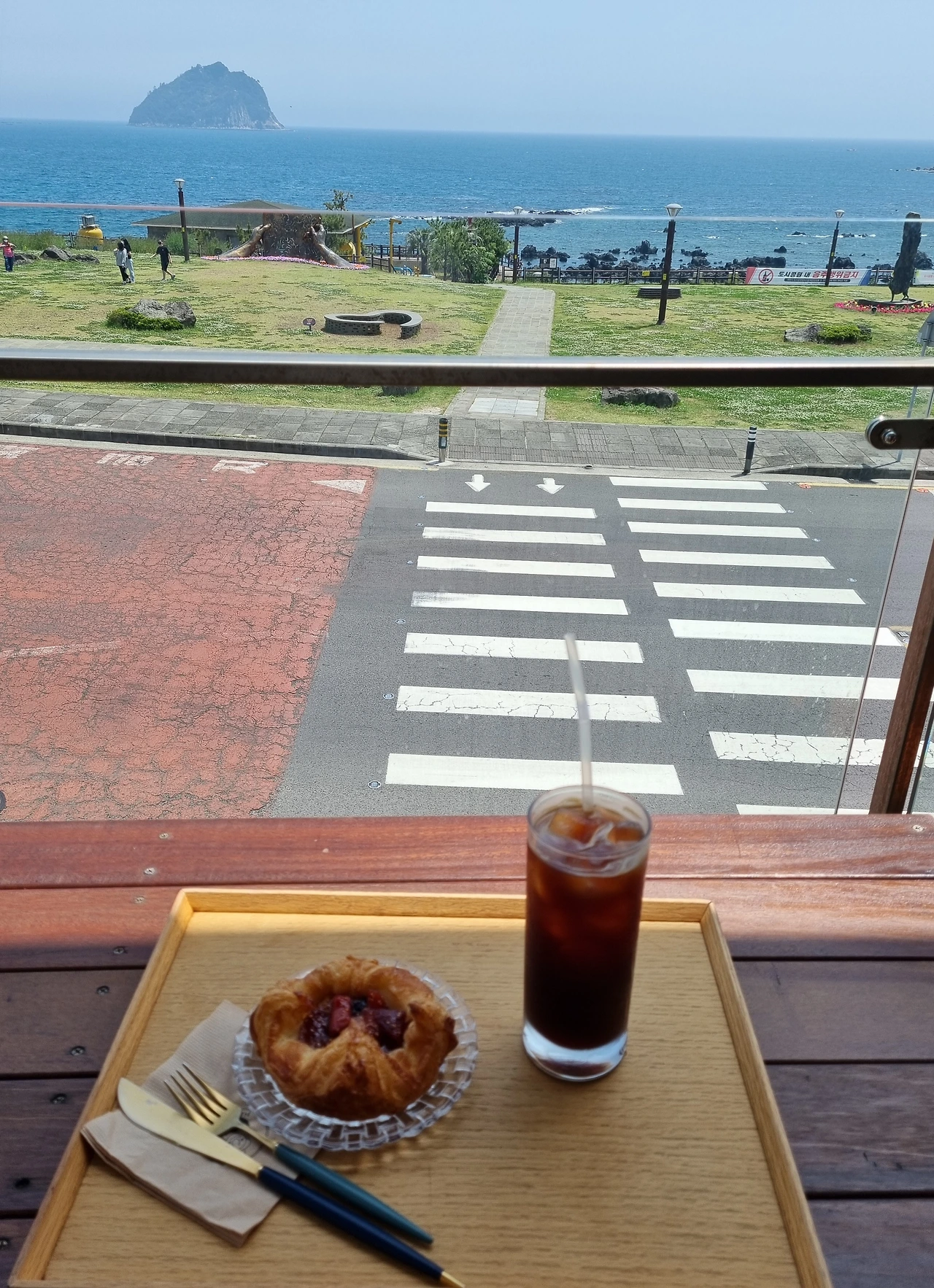 길 건너편 2층에 앉아있는 나는 다른 곳으로 시선을 돌리지 않고 자연스럽게 그 광경을 지켜보고 있다. 엄마는 아이를 안아주면서 뭐라고 말하는 것 같았는데 들리지는 않는다. 아이의 울음은 잦아드는 듯 보였지만 여전히 훌쩍거리고 있다. 세 살배기 쪼꼬미를 안고 엄마가 횡단보도를 건너자고 손짓을 한다. 신호등이 없는 짧은 바닷가 앞 횡단보도다. 큰 아이가 앞으로 뛰고 엄마는 쪼꼬미를 안고 뒤를 돌아 둘째를 바라본다. 울고 있던 둘째는 울면서도 오른손을 번쩍 들고 하얀 줄무늬 횡단보도를 건넌다. 무의식 중에 손을 올리며 건너는 모습에 빙그레 웃음이 났다.