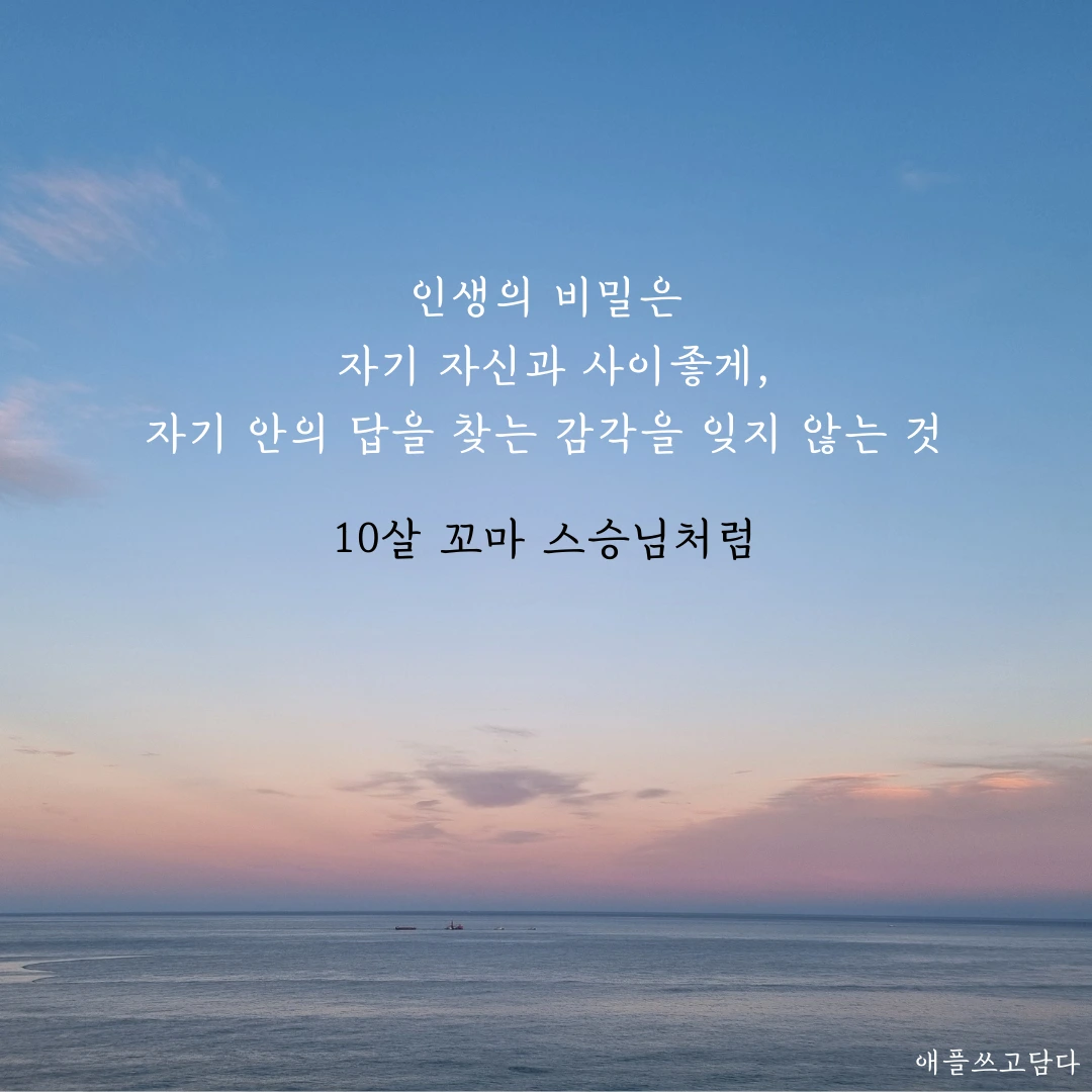 '웃으면 돼.'라는 스승님의 말에 울림이 있었던 것은 아니다. 웃으면 복이 온다, 의도적으로 웃어라, 라는 말은 살아오면서 수없이 들었다. 실제로 포스트잇으로 붙여두기도 했고, 다이어리에 적어놓기도 했다. 그런데 그것은 내 안의 답이 아니었다. 외부에서 들었던 좋은 말을 따라한 것뿐이었다. '그냥 혼자 해봤어.' 10살 꼬마 스승님은 자기 자신에게 스스로 묻고, 자신만의 답을 찾아가는 법을 알고 있었다. 아마도 우리 모두가 열 살 즈음에는 그러했을 것이다. 그런데 어느 순간부터 외부에서 '이래야 한다, 저래야 한다' 라는 너무 많은 정보가 들어왔다. 자라면서 우리는 열 살 즈음에 알고 있던 인생의 비밀을 하나씩 잊고 살고 있는 것은 아닐까.