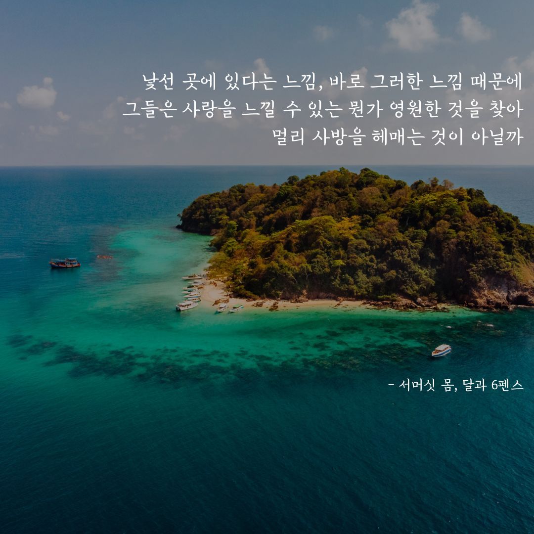 타히티를 떠올린 것은내가 좋아하는 소설 '달과 6펜스' 때문일 것이다. 주인공 찰스는 런던에서 잘 나가는 금융중개인이지만 오로지 그림을 그리기 위해 안정적인 직장과 가정을 버리고 훌쩍 파리로 떠난다. '떠나버린다'라는 표현이 더 적합할 것이다. '떠나버린다'는 '떠난다'에 비해 운명에 몸을 맡기는 느낌이 드는 단어다. '달과 6펜스'는 화가 폴 고갱의 삶을 바탕으로 쓰인 작품으로, 실제 고갱은 파리를 떠나 남태평양 '타히티'로 이주하여 창작활동을 이어갔다. 꽉 짜인 현실에서 벗어나 본인이 원하는 대로 자유롭게 살고자 하는 욕망은 우리 모두에게 내재되어있다. 익숙한 곳을 홀연히 떠나는 그들의 '낯설게 하기'는, '살아있음'이 아니고 무엇이겠는가.
