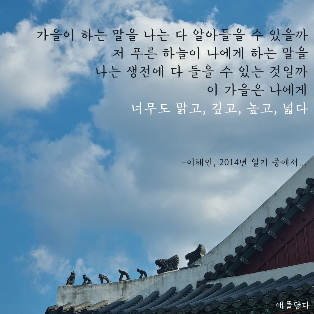 이해인 수녀님은 소녀감성인 엄마가 가장 사랑하는 분. 가을이 어떤 말을 하는지 듣고 싶은 저 마음을, 아름답다는 말이 아닌 어떤 말로 표현할 수 있을까. 시골에서 자랐던 엄마는, 자연을 노래하는 이해인 수녀님의 시를 외우면서 순수한 감성을 키워나갔을 것이다. 엄마는 충청도 시골 동네에서 자랐다. 시내에는 공주 사범대학교가 있었는데 그곳에서 주최하는 시 쓰기 대회에서 엄마와 이모들 여럿은 돌아가면서 상을 받았다고 했다. 자연에서 뛰놀며 자연에 물들어있던 소녀들은, 이제 60대, 70대, 80대로 곱게 자랐다. 늦가을이 되어가는 나이에도 시를 쓰고 상을 받았던 어린 시절은, 여전히 그녀들의 자랑거리이겠다. 시를 사랑하는 마음은 그녀들에게서 배웠으리라. 아니 물들었으리라.