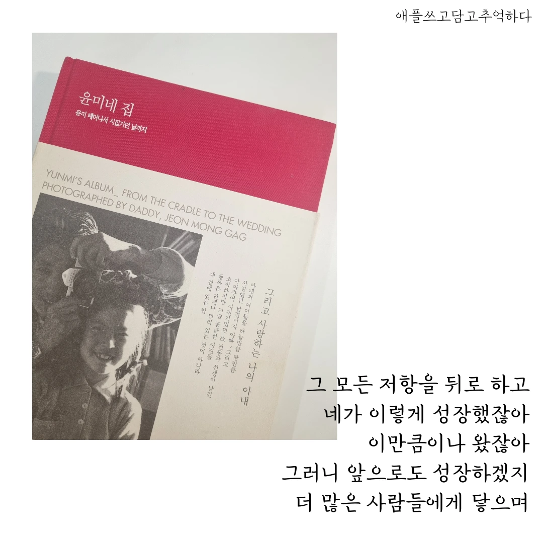 p.s 사진 찍기에 취해있던 시절, 갖고 싶지만 돈이 없어 못 샀던 사진집, 고 전몽각 선생의 유작 '윤미네 집'. 어느 날, 선생님이 선물로 건네주셨어요. 아무도 돈 주고 사진집을 사지 않던 시절.. 내 마음을 읽는 사람도 있구나, 기쁘게 놀랐던 기억. 산타 같았어요. 책 표지도 빨간색. 평생 잊지 못할 선물.