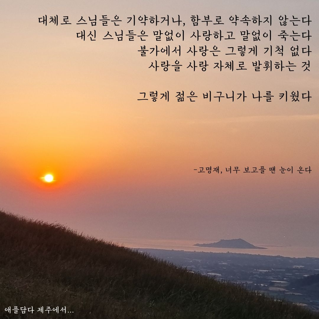 문득, 시인은 본인이 이런 말을 자주 하는 것을 알고 있을까?라는 생각이 들어 빙그레 웃음이 났다. 우리는 음... 시 좋네? 정도인데 본인은 사랑의 안경을 낀 줄도 모르고 '아름답죠, 아름답죠?' 하는 느낌. 서서히 나에게도 그 아름다움이 스며들어 몽글몽글해지는 느낌. 나도 저런 말을 하며 살아야지, 다짐하게 되는 시인의 아름다운 말습관.