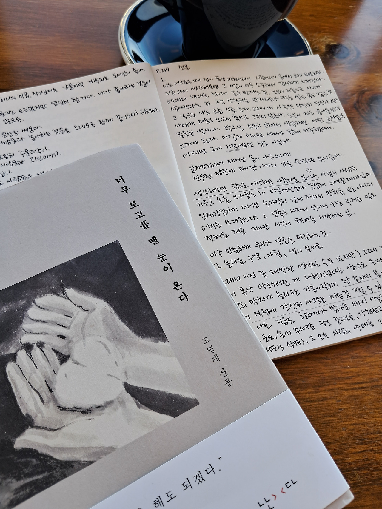 글을 쓰기 전에, 필사 한 장 하는 것이 요즘 나만의 리츄얼. 김민정 시인이 강연에서 산문을 잘 쓰려면 어떻게 하면 되나요?라는 어떤 분의 질문에 '고명재 시인 산문집을 필사해 보세요.'라고 답변하셨다. 나는 마음이 동하면 말을 잘 듣는 편. 바로 실행하는 편. (자주 동하지 않는 게 함정) 오늘은 '전분씨' 이야기. 나의 엄마가 누군가의 딸이었다는 명백한 사실을 일 년에 한 번도 떠올리지 않고 살고 있었군요. 그녀는 그녀를 닮았겠지요. 세상에. 나도 그녀를 닮았겠군요. "생각해 보면 참으로 이상하고 아름다운 일이다."라는 고시인의 문장을 곱씹어봅니다.