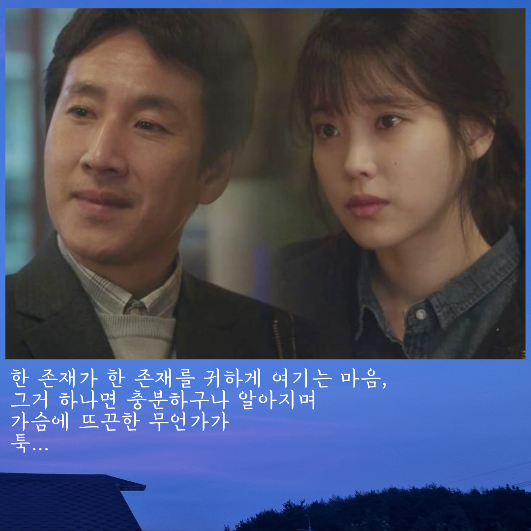 드라마 '나의 아저씨'를 통해 깨달은 것은 한 존재가 한 존재를 살리는 데는 조건이 필요치 않다는 것이다. 가족, 친구, 함께 한 시간.... 그러한 조건이 채워져야 사랑할 수 있는 것은 아니다. 내 앞에 존재를 귀하게 여기는 마음, 사랑하는 마음 하나면 되는 거였다.지안과 박동훈 부장이 서로에게 그랬듯이.