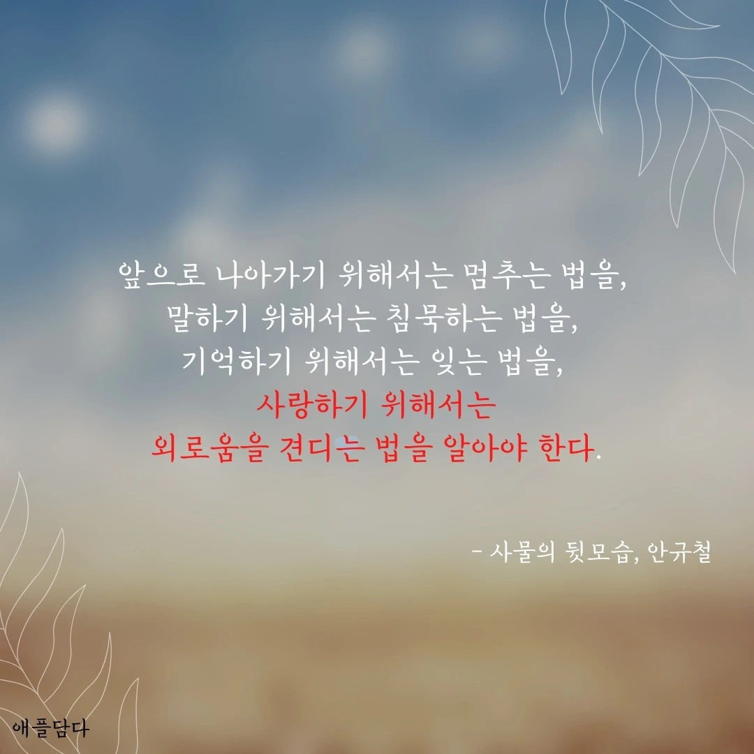 우리는 한쪽 방향만 발달되어 살아온 것이다. 동전의 앞면에 어김없이 뒷면이 존재하듯이, 앞모습만으로 살아갈 수는 없다. 대학시절, 가장 어려웠던 것은 '관계'였다. 관계의 다른 이름은 '사랑'이니 사랑이 힘들었다, 하겠다. 그런데 그걸 가르쳐주는 과목이 없었다. 헤어지는 법, 외로움을 견디는 법, 멈추는 법, 그것으로부터 나오는 법... 앞으로 나아가는 것만 배웠던 나는 '관계'속에서 방황했다.