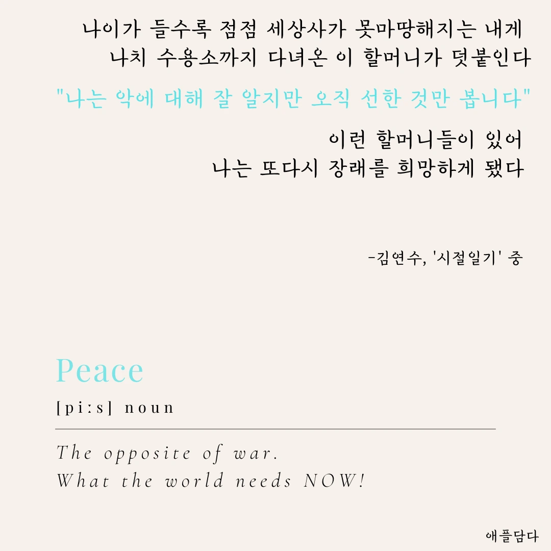 나는 전쟁을 경험한 바가 없고, 다행히도 '악'에 대해 피부에 와닿은 경험 역시 적다. 그나마 세상의 부조리를 한탄하는 정도였다. 그러기에 세계에서 일어나는 '전쟁'에 대해서 어떤 입장을 취한다는 게 조심스러웠다. 그러던 중에, 오랜만에 다시 펼친 김연수의 '시절일기'에서 내가 원하는 답을 찾은 듯해서 반가웠다.