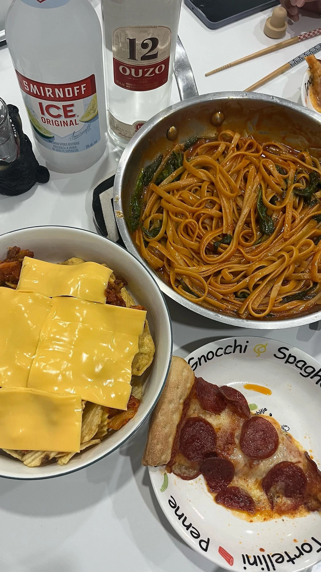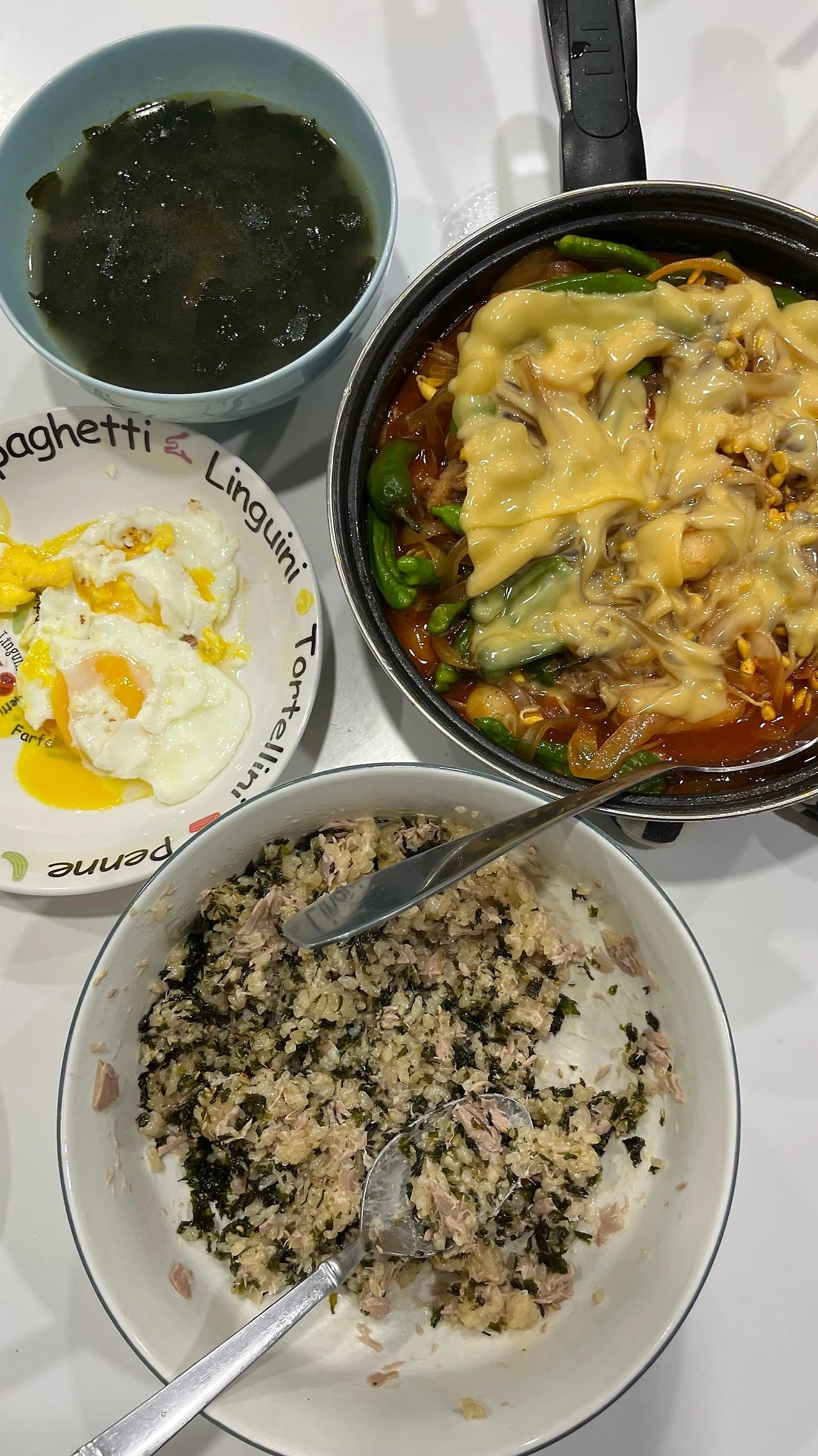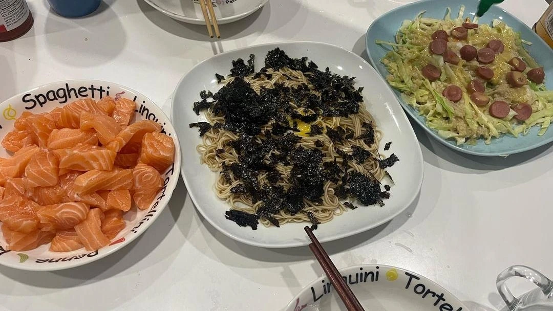 - 불닭소스 + 남은 파스타 면 + 베이컨 + 남은 시금치
