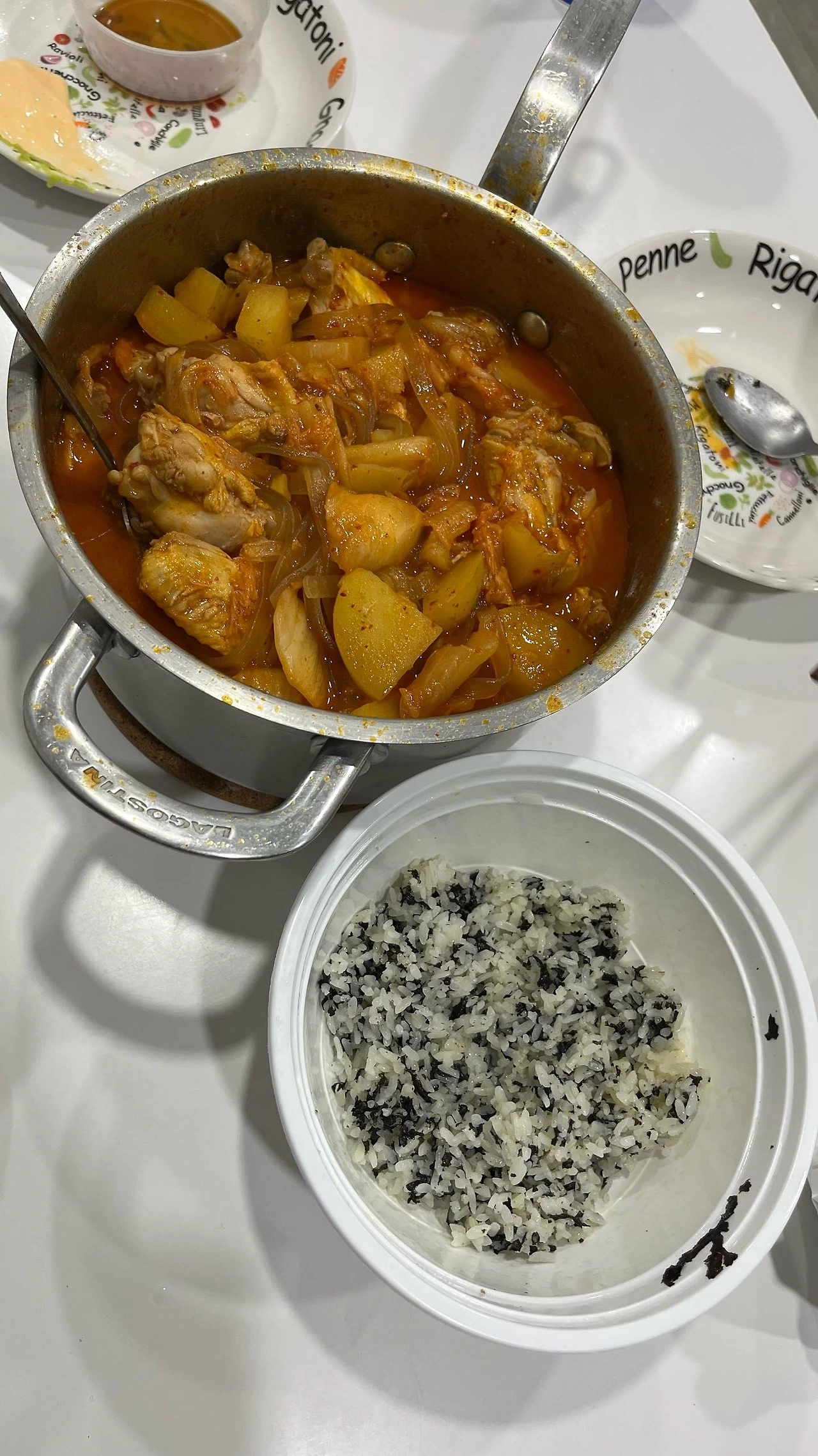 - 코스트코 윙,봉 + 너무 많아서 썩어가던 감자 + 양파 + 남아있던 넓적당면 + 김치 한 데 모아 끓인 윙봉도리탕