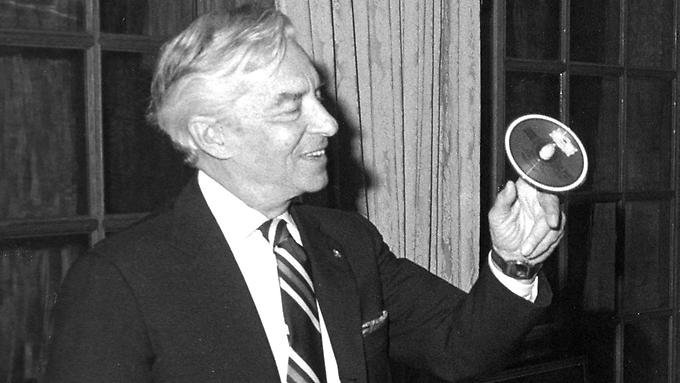 1982년 세계 최초로 CDDA가 출시되었을 때의 카라얀. 사진 속의 CD는 하노버의 도이췌 그라모폰사 것이다 카라얀의 이러한 신기술 매체에 대한 욕심은 끝이 없었다.