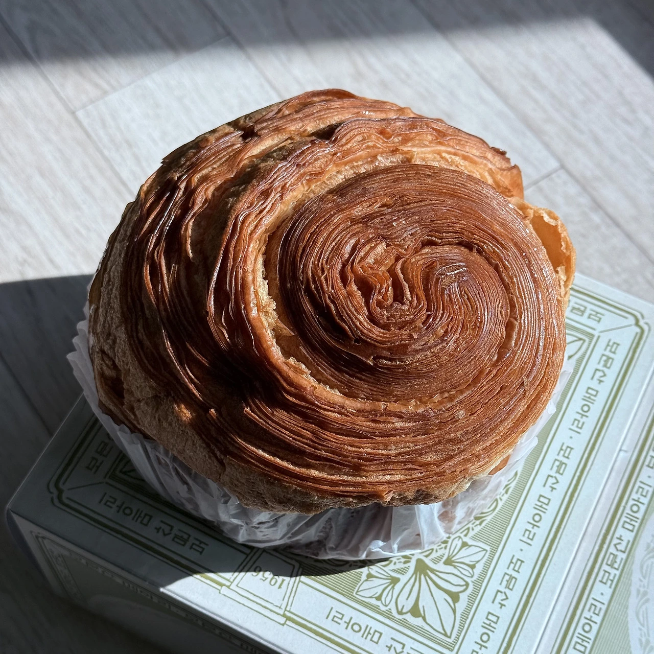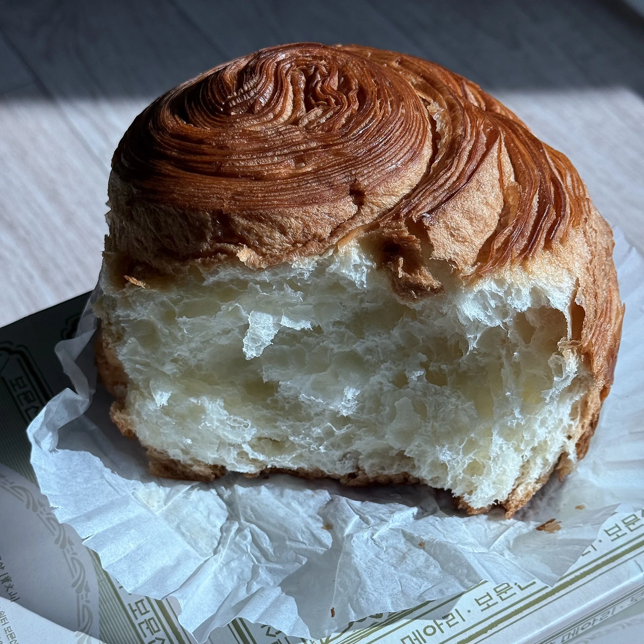 차분하게 바삭한 이 식감은 마치 밀랍을 닮았다. 밀랍의 식감과 반짝이는 단맛의 교차. 이건 혹시 보문산의 벌집을 표현한 게 아닐까 하는 생각도 들었다. 중요한 것은 칼로 자르면 이 느낌이 나지 않을 것 같다는 확신이다. 이 빵은 반드시 뜯어내진 표면에서 오는 불규칙적이고 보슬보슬한 결의 질감의 느끼는 것이 중요하다.