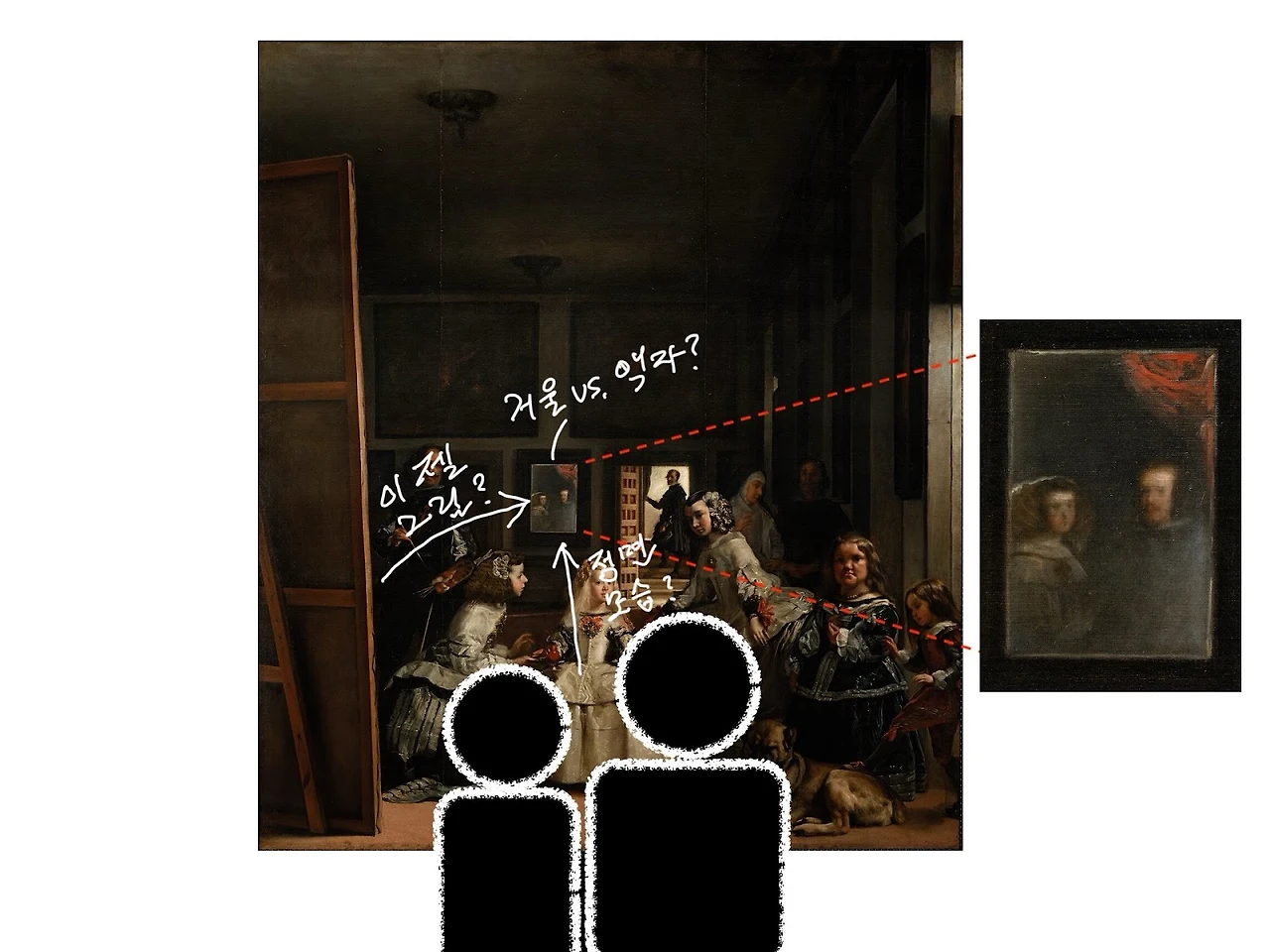 그럼 그림 속 화가는 이 공주를 그리고 있는 게 맞을까? 보통 모델을 그릴 때 서로 마주 보면서 직접 얼굴을 보며 그림을 그리지 않나? 이 그럼 처럼 오른쪽에서? 살짝 뒤에서 모델을 그린다고? 말이 안 되지 않나? 그래서 여기 또 여러 가지 상상적 해석이 나온다. 첫 번째는 아마도 공주가 바라보고 있는 우리 쪽에 큰 거울이 있어서 그 공주를 비추고 있는 거울을 보고 화가가 그림을 그리고 있는 것 아닐까? 그럴 수도 있을 듯싶은데 직접 마주 보고 그리면 되는데 왜 한 번 비추고 있는 거울을 보고 초상화를 그릴까 라는 의문이 든다. 혹시, 마르가리타 공주를 포함한 지금 화가의 스튜디오 안의 전체 모습을 그림 속에 담으려고 일부러 큰 거울을 우리 쪽에 놓고 ‘화실 안에 있는 공주의 모습’을 그리려고 이렇게 그린 거 아닐까? 그럴 수 있겠는데?