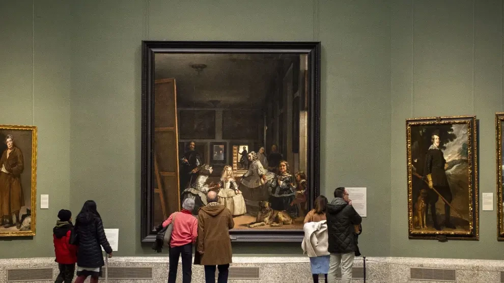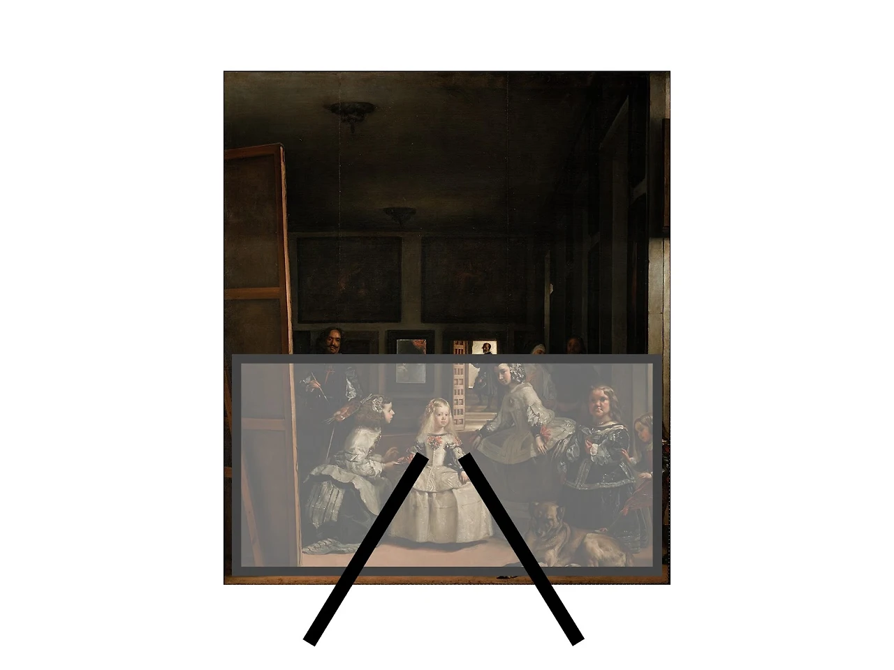 벨라스케스의 ‘시녀들 Las Meninas’ 작품이 뭐길래 다들 극찬을 하는 걸까? 그냥 언뜻 보기에는 벨라스케스 작가의 화실에서 한 공주를 그리고 있는 모습일 뿐인데 말이다. 그럼 이 그림 속으로 천천히 한 번 들어가 볼까? 일단 힘 빼고 가볍게 보이는 것부터 천천히 살펴보자. 천장이 엄청 높은 화실이구나. 저렇게 높은 천장 끝까지 닿는 왼쪽의 이젤이 실제로 있나 싶을 만큼 커 보인다. 사람들이 모두 아래쪽으로 몰려 있어 위쪽 빈 공간을 많이 확보하여 더 높은 천장 효과를 내고 있다. 사실 저 높은 벽면에 두 액자가 걸려 있는데 왼쪽 작품은 루벤스의 ‘아라크네를 벌주는 팔라스 아테네’이고 오른쪽은 요르단스의 ‘아폴로와 판’이라는 작품으로 두 작품 모두 신에게 도전하는 인간의 주제라는 공통점이 있어 그 앞에 서 있는 화가 자신, 즉 벨라스케스도 예술로 신의 경지까지 가 보리라 라는 메시지를 담고 있다고 해석하기도 하는데 너무 과한 해석 아닐까? 아무튼, 실제로 이 작품은 사이즈가 세로가 3미터가 넘는 318 cm × 276 cm 으로 프라도 미술관에 전시되어 있는 그림들 중에서도 압도적이다.