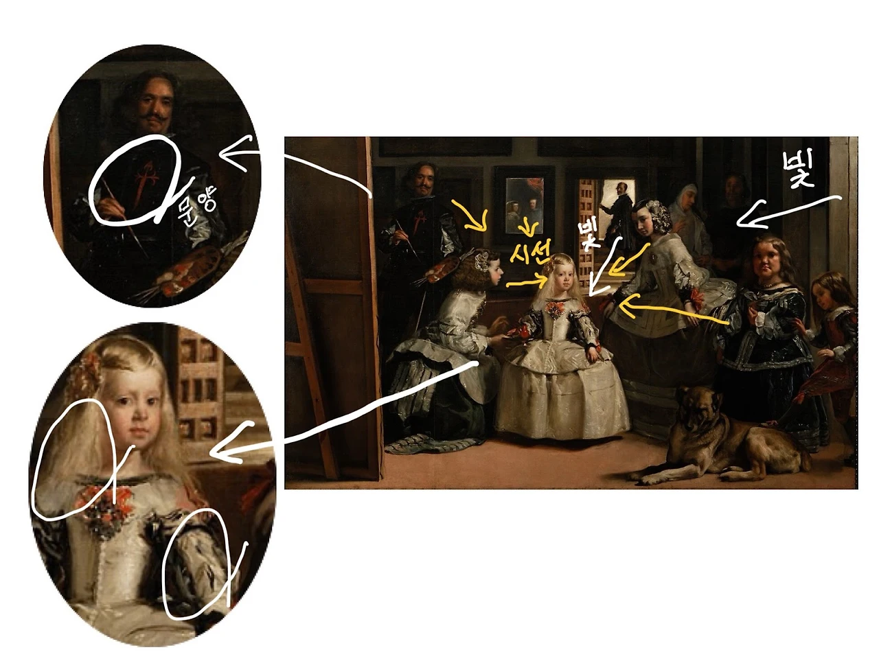 왼쪽 위: 붉은 십자가 문양의 기사 작위 문양을 그려 넣은 벨라스케스, 왼쪽 아래: 왼팔의 살짝 벌어진 절개 표현과 공주의 머리카락 한 올 한 올 살아있게 표현하고 있는 벨라스케스의 기법, 오른쪽: 뒤의 열린 문에서 나오는 빛과 오른쪽에서 들어오는 빛의 두 가지 빛으로 인물의 강약을 효과적으로 표현하고 있는 모습.