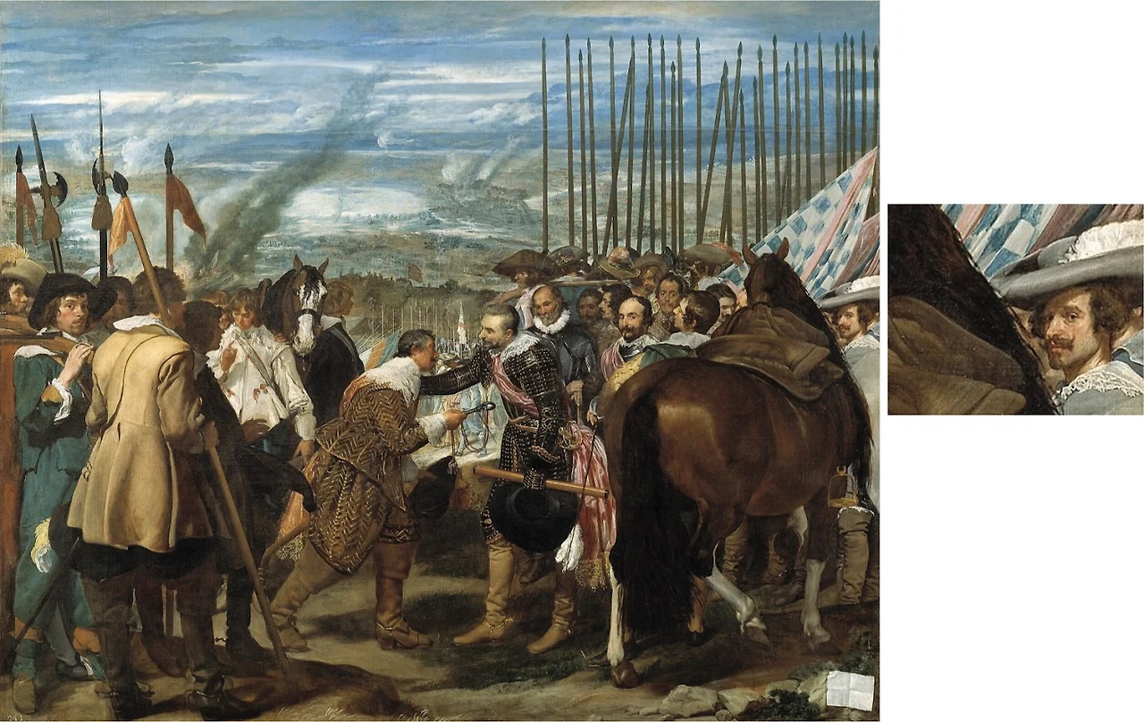 벨라스케스가 그린 자화상이 맞을 것으로 보는 또 다른 작품이 하나 더 있다. 벨라스케스 하면 가장 대표적인 작품인 ‘시녀들, 라스 메니나스 Las Meninas’ 작품이다. 이 작품 속 왼쪽 큰 이젤 앞에 한 손엔 팔레트를 들고 다른 손엔 붓을 잡고 그림을 그리고 있는 이 인물, 위의 ‘아마도 자화상’ 얼굴과 너무나 닮아있지 않나? 누가 봐도 직업이 그림 그리는 화가이면서 벨라스케스 아닌가? 그냥 콧수염 하나로 벨라스케스인걸? 이렇게 벨라스케스는 자신의 작품 속에 주인공이 아닌 카메오 느낌으로 자신을 자주 그려 넣었던 화가이다.