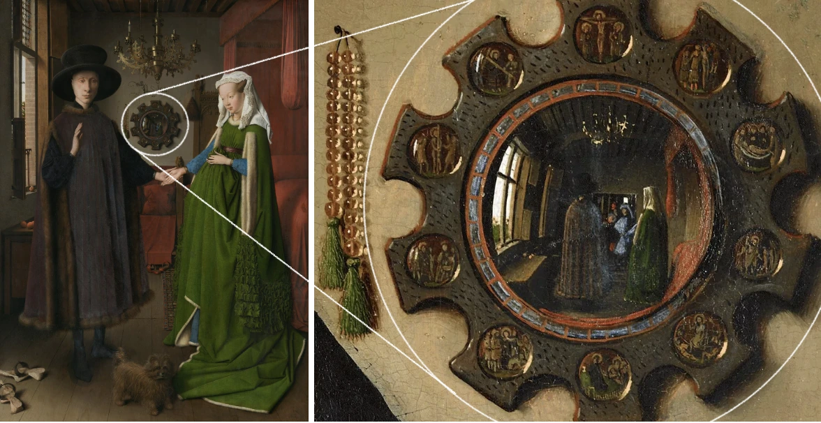그럼 여기서 또 드는 의문이 화가가 공주를 그리고 있는 게 아니라면? 공주의 맞은편, 다시 말해서 그림을 보고 있는 우리 쪽에 누군가 있고 그 사람을 그리고 있다면? 그 그림 그리고 있는 사람을 공주가 보러 온 거라면? 그 사람이 누군데? 이 쯤되자 뒤쪽 액자 속에 있는 두 사람이 눈에 들어온다. 자세히 보니 바로 왕인 펠리페 4세와 마리아나 왕비인 것으로 보인다. 아, 엄마 아빠 초상화 그리고 있는데 아기인 딸 마르가리타 공주가 구경 왔구나! 여기까지 상상력이 미친다. 그럼 저 액자는 그림이 아니라 거울인가 보다. 마르가리타 공주 맞은편인 우리 쪽에 앉아 있는 왕과 왕비가 거울이 비친 모습으로 표현했구나, 대단한데? 여기까지 상상력이 미친다. 이렇게 작품의 중앙에 거울을 놓고 우리가 보지 못하는 부분을 보이게 하는 기법은 벨라스케스 이전 화가인 얀 반 아이크 Jan van Eyck 의 ‘아르놀피니의 초상 The Arnolfini Portrait, 1434’ 을 연상케 한다. 지금은 이 작품이 런던 내셔널 갤러리에 있는데 그 당시는 펠리페 4세의 방에 걸려 있었던 작품으로 벨라스케스가 이 작품을 보고 영감을 받아 그린 것으로 보인다. 얀 반 아이크도 대단한 인물인 것이 1400년대에 볼록한 거울을 비추어 방 안 전체 장면을 보이게 한 아이디어가 대단히 놀랍고, 유화를 저렇게 디테일하게 사용할 수 있었다는 것에 또 한 번 놀랍다. 잠깐, 거울을 둘러싸고 있는 10개의 작은 원형의 메달에 예수의 수난 장면을 그려 넣은 것을 보았는가? 하, 감탄만 나올 뿐이다.