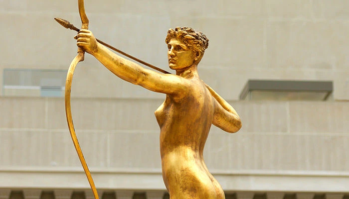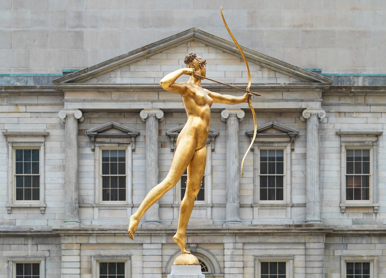 아메리칸 윙의 정 한가운데 서 있는 금색의 다이애나 동상이다. 작가인 아우구스투스 생고든스 (1848 – 1907)는 미국 남북전쟁의 영웅들의 기념비를 많이 만들었던 조각가이다. 처음 생고덴스가 만들었던 다이애나 조각상은 1892-1893년 뉴욕 매디슨 스퀘어 가든 타워의 꼭대기 풍향계였다. 이 건물의 건축가였던 스탠포드 화이트가 친구였던 생고덴스에게 재료비만 주고 무료로 만들어 달라고 부탁하여 만들어 주었다고 한다. 두 가지 버전이 있었는데 첫 번째 버전은 동상 높이가 5.5m에 무게는 820kg의 다소 무거워서 풍향계 역할은 제대로 못 했었다고 한다. 1891년에 92.6m 인 건물 위에 얹으니 그 도시에서 가장 높은 건축물이 된다. 두 번째 버전은 이전보다 더 업그레이드하여 포즈도 우아하게 바꾸고, 더 날씬하게, 다리도 좀 더 우아하게 각도도 조정하고 높이 또한 4.4m로 더 작게 만들며 무게 또한 속은 빈 구리로 318kg로 낮춰 이전 무게보다 반 이상 줄여 이제야 풍향계 역할을 제대로 하게 만든다. 1893년 11월 18일 다시 탑 꼭대기에 설치하니 낮에는 금박의 반짝임이 뉴욕 도심 곳곳에서 보이고 날씨 좋을 때는 뉴저지에서까지 볼 수 있었다고 하며 저녁에는 역사상 최초의 전기로 밝혀진 조각상으로 라이트 조명이 비추게 하여 단연 뉴욕의 가장 인기 있는 랜드마크가 된다. 이후 매디슨 스퀘어 가든은 1925년 철거되면서 이 다이애나 상은 약 7년의 전시 공간을 찾다가 필라델피아 미술관에 기증한다.