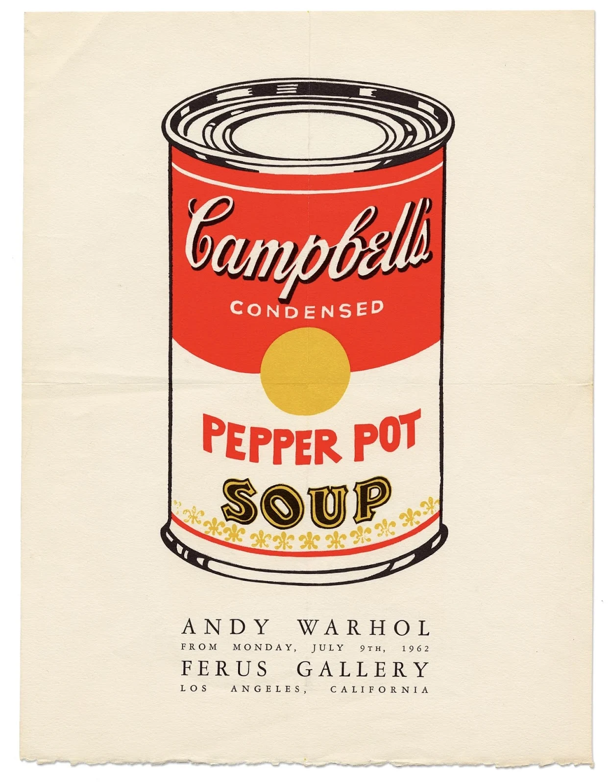 1961년 11월에 작품 구상 & 시작하여 1962년 3,4월에 완성한 후, 1962년 7월 9일 로스앤젤레스에 있는 조그만 갤러리(Ferus Gallery)에서 앤디 워홀이 없는 상태로 전시 오픈된다. 오픈해서 지금까지도 논쟁거리의 중심에 앤디 워홀과 거의 동의어로 취급되는 캠벨 수프 캔이다.