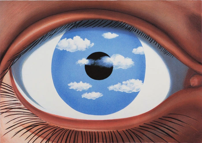 실제의 파란 하늘과 실제의 하얀 구름이 있는 그 하늘인가? 그것 보다는 거울처럼 비친 가짜의, 허상의 하늘 아닌가? 실제 하늘은 우리가 보고 있는 하늘이 아닌, 저 위에 존재하는 하늘이 실제 하늘이 아닌가? 실제의 파란 하늘과 실제의 하얀 구름의 그 하늘인가? 그것 보다는 우리 눈에 거울처럼 비친 가짜의, 허상의 하늘 아닌가? 실제 하늘은 우리 눈으로 보여지는 하늘이 아닌, 저 위에 존재하는 하늘이 실제 하늘 일텐데, 우리의 눈은 그 실제가 비춰서 보이는 거울 같은, 그래서 허상의 거울 The False Mirror, 우리 눈은 가짜 거울 같은 것 아닌가? 우리가 눈으로 보는 이 세상은 실제의 세상이 아닌 거울에 비친 모습처럼 우리 눈에 비친 가짜의 세상 아닌가? 아, 르네 마그리트, 철학자의 면모를 유감없이 보여주고 있다.