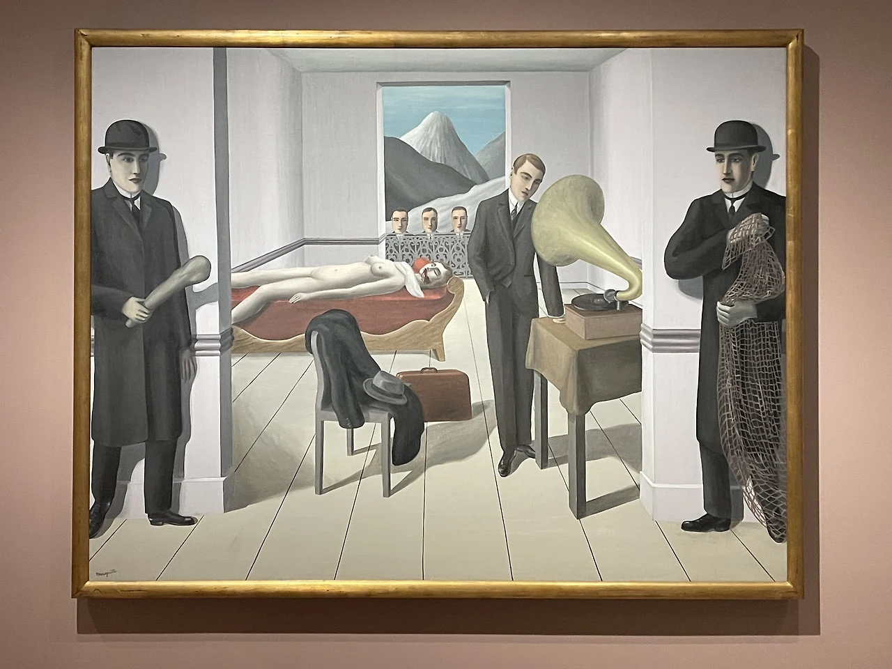 피를 흘리고 죽어 있는 여인 옆에 도망가지 않고 너무나 여유롭게 축음기로 음악을 듣고 있는 암살자, 그를 잡기에는 너무나 터무니 없는 몽둥이와 그물을 들고 숨어 있는 양쪽의 수사관들, 우리만 이 상황을 지켜보고 있는 줄 알았는데, 창문 너머 발코니에서 우리와 똑 같이 이 모든 것을 지켜보고 있어 깜짝 놀라게 만드는 세 남자, 르네 마그리트의 전형적인 초현실적인 작품. (마그리트가 좋아했던 1912-14년 연작 스릴러 소설 ‘Fantômas 팡토마’에서 영감을 받아 그린 작품)