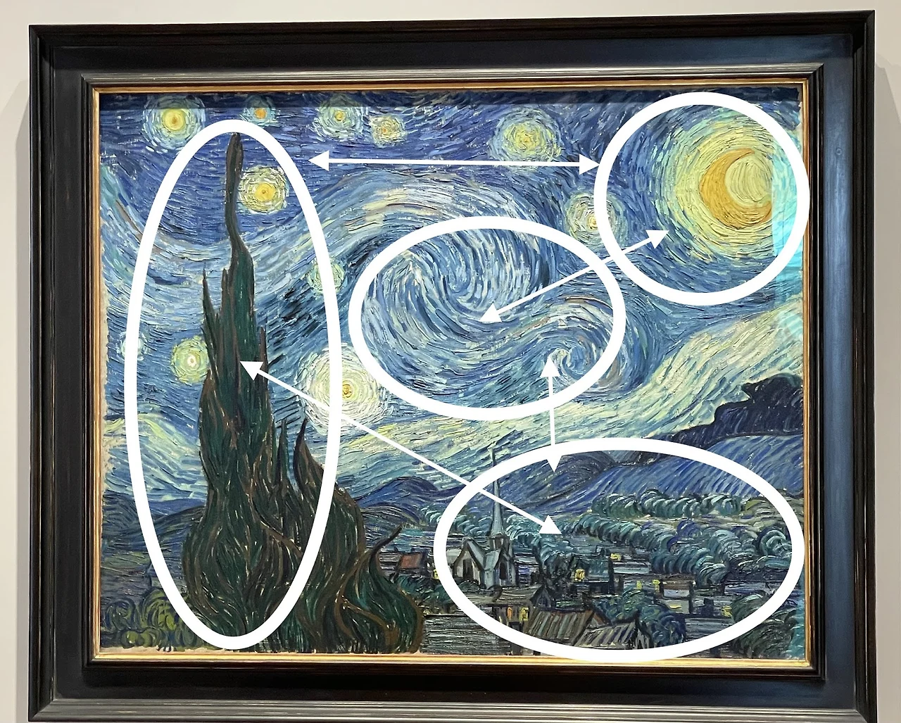 사이프러스 나무와 반대 의미의, 너무나 평화롭고 따뜻해 보이는 오른편 아래 마을을 감싸고 있는 나무들이 올리브 나무이다. 이 올리브 나무 또한 반 고흐가 참 좋아했던 나무이자 많은 작품들에서 표현되는데, 성경에서 올리브 나무는 노아 Noah가 비가 그쳤는지 알아보기 위해 보낸 두 번째 비둘기가 입에 물고 왔던 나뭇잎이 올리브 나뭇잎으로 '새 생명의 시작, 평화'라는 의미로 읽혀진다.