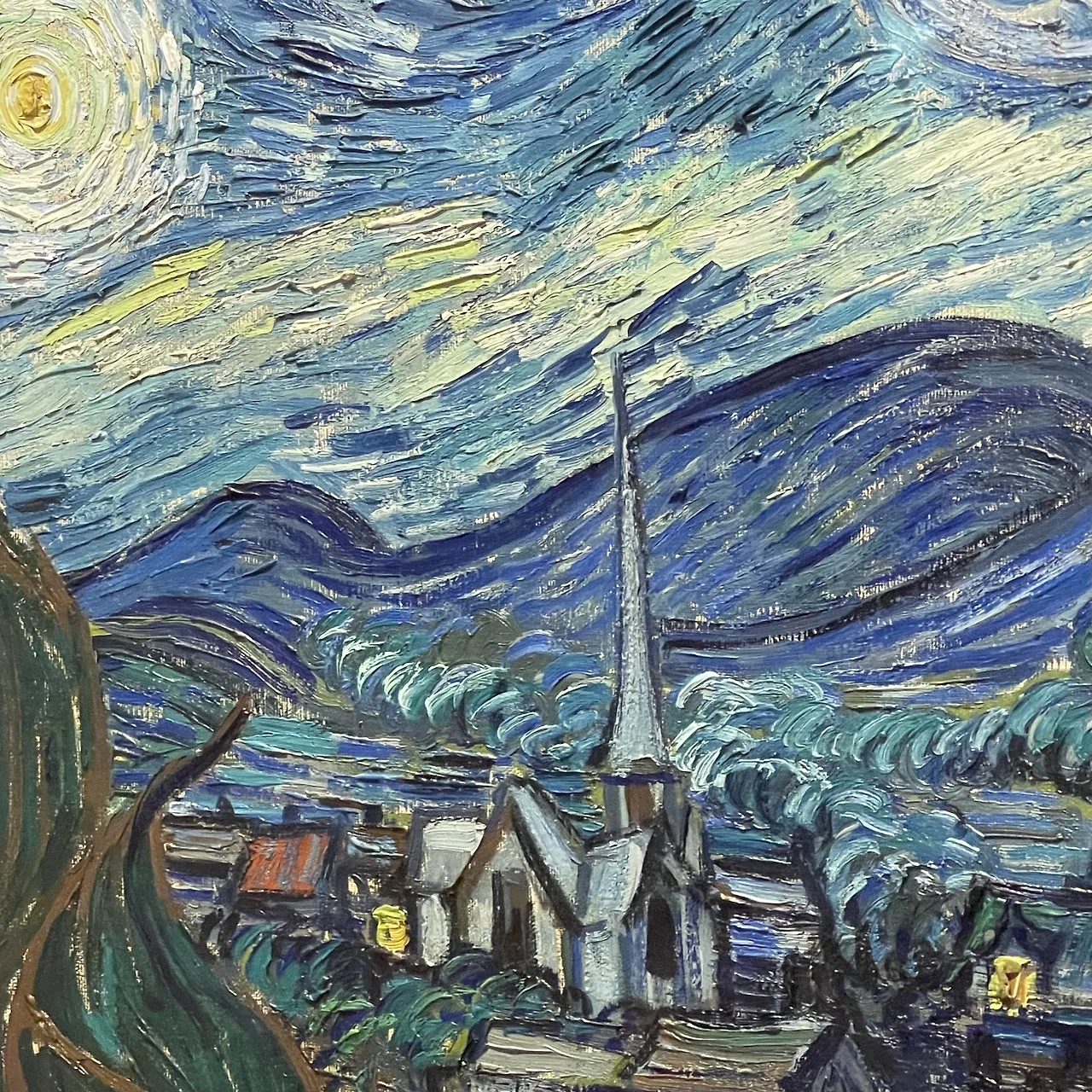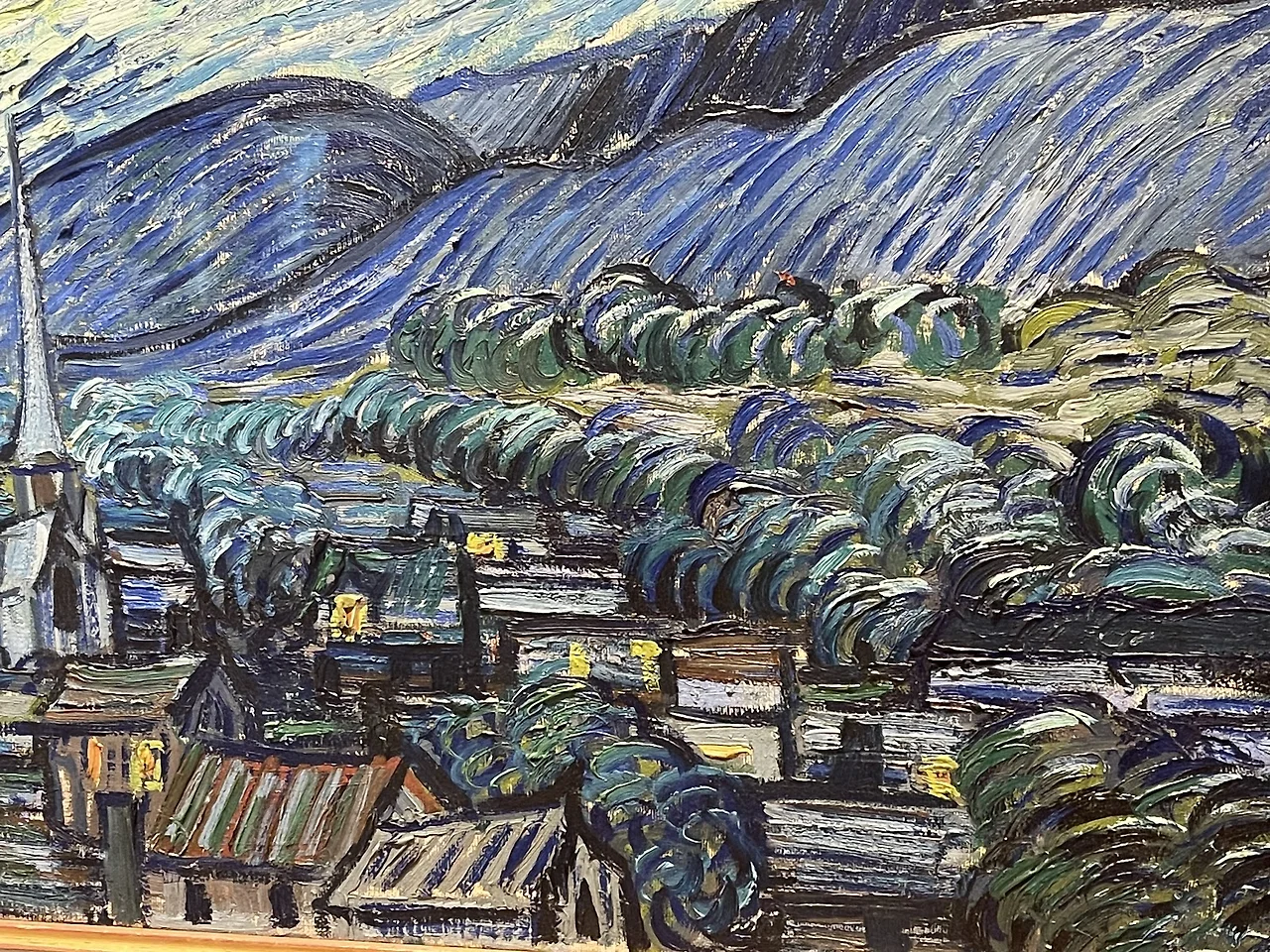 그림에서 아래 표현되고 있는 마을의 모습은, 실제로 생 레미 반 고흐 의 방에서 보면 보이지 않는 마을이다. 들판만 보일 뿐인 공간인데, 마을을 그려 넣은 것으로 보아 상상의 마을이라 볼 수 있다. 그럼 반 고흐는 어디를 상상한 걸까? 상상을 엿볼수 있는 힌트가 길게 뻗어 있는 첨탑의 교회이다. 저 교회는 반 고흐가 이전에 그렸던 네덜란드 뉘넨 Nuenen의 교회인 것으로 보아, 네델란드 마을의 모습을 표현한 것으로 보인다. 힘들고 지친 현재의 반 고흐에게 가장 필요한 곳, 편하게 쉴 수 있는 자신의 나라인 네델란드를 생각하며 그려 넣은게 아닐까?