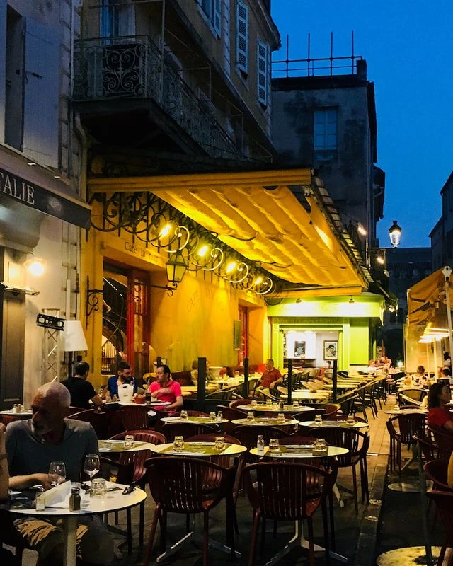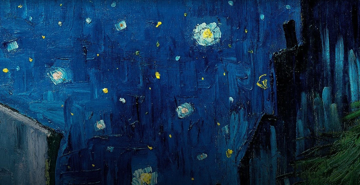 아를에서 그린 ‘밤의 카페 테라스 Terrace of a café at night’ 작품은, 노란색이 워낙 강렬하여 강한 노란색만 보고 지나치는 경우가 많은데, 반 고흐가 이 작품에서 가장 심혈을 기울이고, 그리면서 가장 행복감을 느꼈다고 하는 곳이 바로 저 위의 밤하늘의 별들이다. 팝콘처럼 터지는 파란 하늘의 별 모습이 너무나 아름답게 빛나고 있는데, 밤하늘 그림의 초기라 조금은 소극적으로 표현한 모습이다.