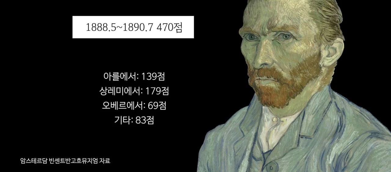 반 고흐가 우리 곁을 떠난 해가 1890년 7월 29일, 죽기 약 1년 전이다. 짧은 인생 37년 동안 마지막 예술에 대한 열정을 온통 그림에 쏟아부은 그 시기 1889년이다. 1888년 5월 - 1890년 7월 죽기 전까지 약 2년 동안 그려낸 작품의 수가 무려 470점, 1년이 365일이니 2일에 1점 이상을 그려낸 것이다. 대단한 열정이 아닐 수 없다. 보통의 사람이 한 평생 하기도 힘든 일을 단 37년 짧은 생에 모두 불태우고 갔다.